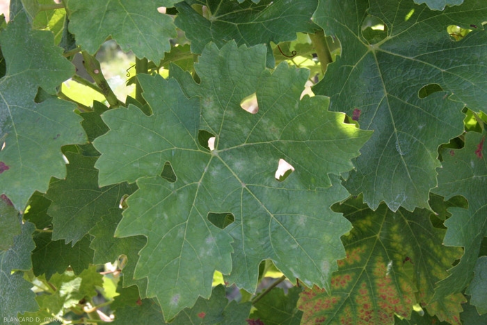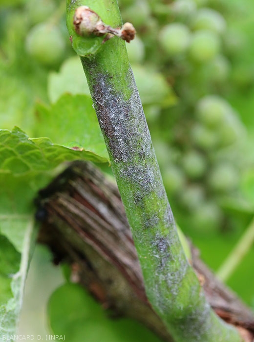 Erysiphe necator est un ectoparasite de la vigne qui se développe en grande partie à la surface des organes aériens verts. Sa présence sur ces derniers est matérialisée par un feutrage conidien plus ou moins poudreux à l'origine de l'appellation anglo-saxonne de la maladie powdery mildew (mildiou poudreux) et caractérisant ces symptômes.