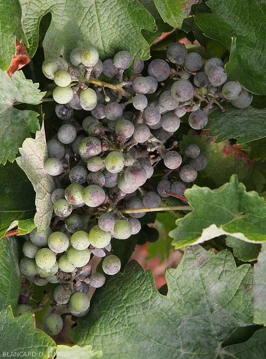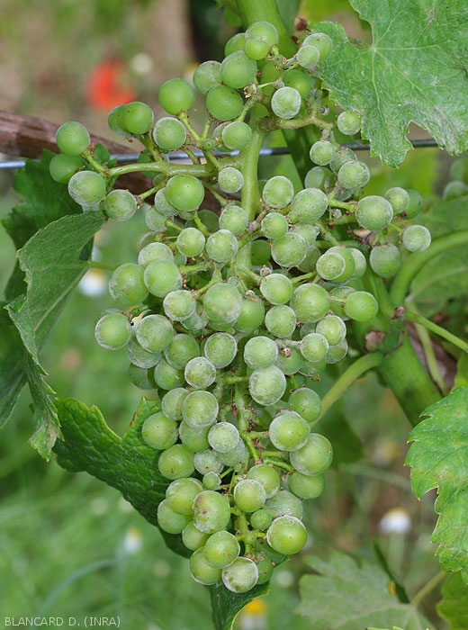 Les inflorescences et les baies de raisin peuvent être attaquées de la floraison à la fermeture de la grappe (figures 9 à 10). Si les premières sont fortement infectées, on assiste alors à des coulures importantes. Les baies se couvrent d'oïdium ce qui leur confère une teinte gris-vert, leur croissance est fortement ralentie et leur pellicule devient plus épaisse et liégeuse. Des éclatements (figure 11) peuvent se manifester, laissant apparaître les pépins. Ajoutons que ces blessures favorisent les contaminations de Botrytis cinerea et des microorganismes responsables de la Pourriture acide.