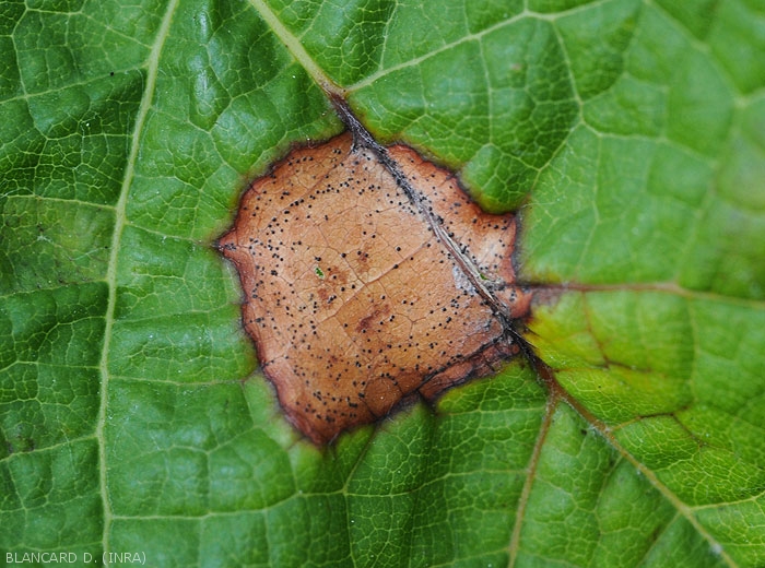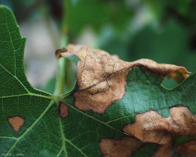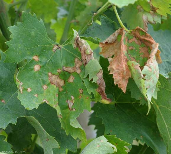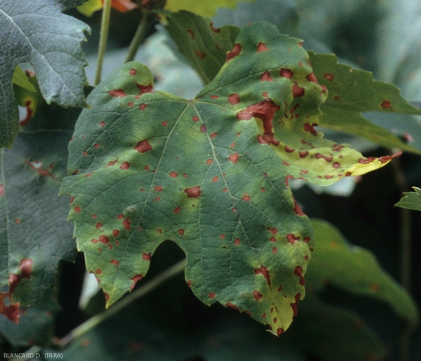 Les symptômes se manifestent tout d'abord sur les feuilles les plus basses de la vigne, car leur environnement est plus humide. Des petites taches, pouvant atteindre 10 mm de diamètre en fin d'évolution, apparaissent sur celles-ci, en général deux semaines après l'infection ; elles sont légèrement chlorotiques dans un premier temps, et de forme circulaire à plus ou moins polygonale (figure 1). Elles s'étendent progressivement et prennent une teinte d'abord grise puis brun clair, tandis que leur périphérie se borde d'un liseré brun foncé (figures 2 et 3). Lorsque les conditions sont favorables, de minuscules structures sphériques noires visibles à l'oeil nu se forment rapidement sur la face supérieure des feuilles (figures 4 et 5) : ce sont les pycnides de la forme imparfaite du champignon. Celles-ci sont disposées concentriquement à la périphérie des taches, ou parfois linéairement le long des nervures. Le nombre de taches présentes sur les feuilles peut varier de quelques lésions à un recouvrement quasi-total des limbes affectés.