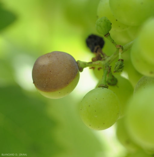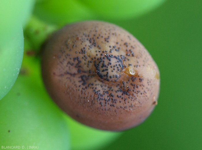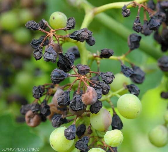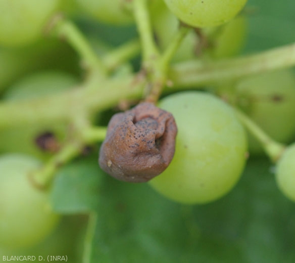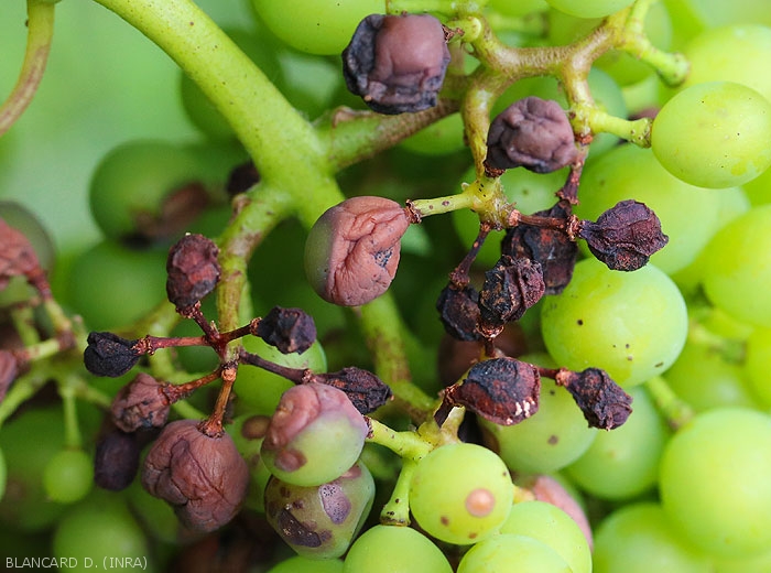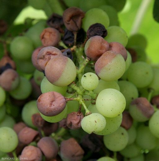 Les baies montrent les dégâts les plus spectaculaires. Elles sont sensibles depuis la nouaison jusqu'au stade fermeture de la grappe et ne sont plus réceptives au-delà de la véraison. Les premières taches apparaissent à demi-véraison (figures 10 et 11) ; elles sont décolorées , circulaires (figure 12) puis déprimées (figure 13). Ces taches grandissent et prennent une couleur caractéristique brun-rouge livide (figure 13)(symptômes à ne pas confondre avec le rot brun occasionné par le mildiou). Des baies entières sont très rapidement altérées, puis elles se ratatinent et se momifient en 3 à 4 jours (figures 14 à 16). Leur couleur devient très particulière : noire avec des reflets bleuâtres. Des ponctuations noires apparaissent en surface ; ce sont les pycnides qui confèrent un aspect rugueux à la baie (figures 17 et 18). La grappe peut être atteinte en totalité ou seulement en partie ; les baies peuvent tomber au sol ou bien se maintenir sur la plante. Si le temps est pluvieux, elles peuvent pourrir.