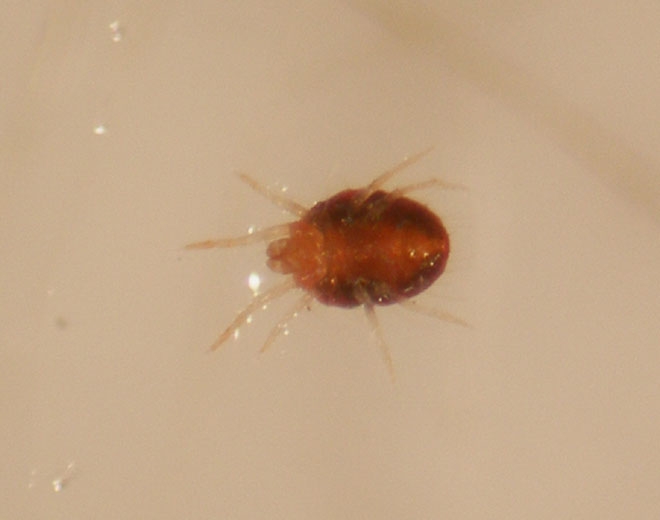 La larve est de couleur rouge à orange vif. Le premier stade larvaire est hexapode alors que les suivants sont octopodes. Les stades de mue sont de couleur rouge plus ou moins vif.