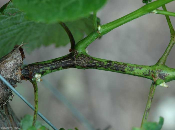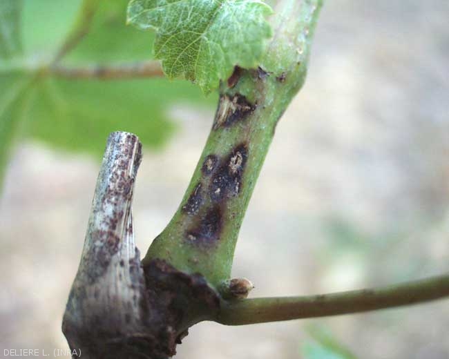 Des lésions apparaissent sur les premiers entre-noeuds de la base des jeunes pousses, souvent en niveau des lenticelles. Elles sont de taille limitée, de forme allongée, et de couleur sombre dans un premier temps (figure 1) ; elles brunissent et noircissent par la suite montrant des reflets bleuâtres (figure 2). Ces lésions nécrotiques deviennent fréquemment chancreuses, les tissus centraux du cortex s'éclaircissant et se fissurant plus ou moins en largeur (figures 3 à 7). Ce dernier phénomène est amplifié en période de croissance rapide de la vigne. Des lésions similaires peuvent être observées sur les pétioles et les pédoncules des inflorescences et des grappes. Celles-ci peuvent conduire au dépérissement de la grappe, qui n'est alors plus alimentée, ou faiblement (figure 8).