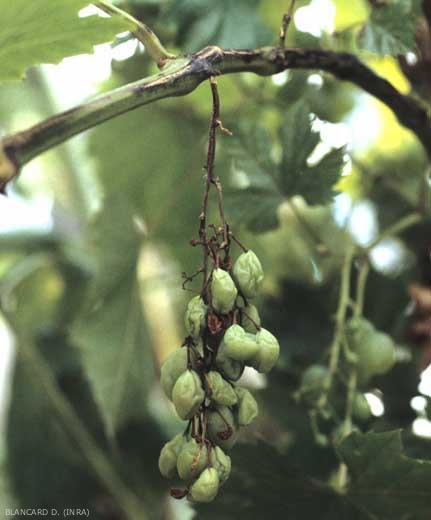 Lors de conditions humides, les nombreuses taches présentes sur les jeunes pousses confluent ; à terme elles présentent de larges plages plus ou moins étendues et subérisées, faisant alterner des plages brunes et des zones plus claires de tissus subérisés. Ajoutons que certaines pousses plus ou moins étranglées, fragilisées par la présence de lésions basales, peuvent à terme rompre et/ou se dessécher sous l'action du vent ou du poids des grappes de raisin (Figure 9).