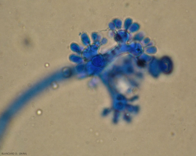 Les conidies assurant la reproduction asexuée de ce champignon sont unicellulaires, ovoïdes, hyalines à légèrement brunâtres (figure 2). Elles mesurent 10-12 x 8-10 µm, dimensions susceptibles de varier en fonction du substrat sur lequel se développe ce champignon. Ajoutons que les conidiophores, surmontés de nombreuses conidies souvent regroupés sous la forme de houppes plus ou moins nombreuses et étendues, sont à l'origine de la moisissure grise(figure 6 et 7).