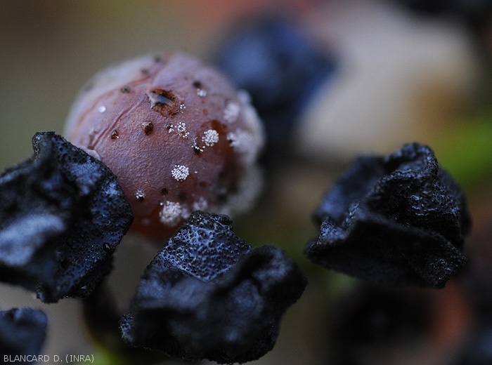 Les sclérotes constituent la principale forme de conservation de Botrytis cinerea. Ils sont petits, arrondis à ovoïdes, aplatis et mesurent de 2 à 5mm de longueur. Ils sont tout d'abord blancs puis brunissent progressivement (figure 8). De fines et régulières ponctuations sont observables à leur surface.