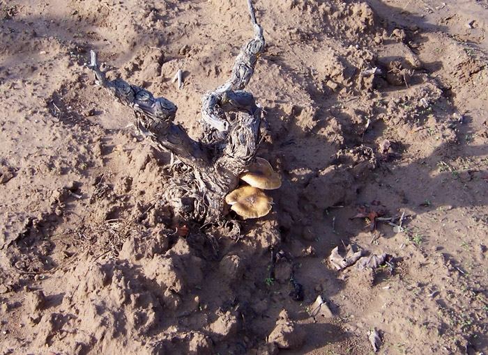 On ne dispose pas d'éléments concernant le cycle biologique des deux autres agents sur la vigne. On peut supposer que celui du Roselinia necatrix est similaire à celui d'A. mellea.