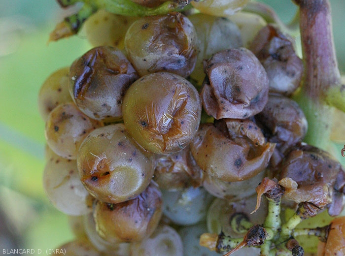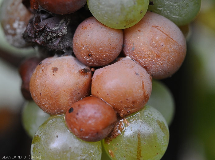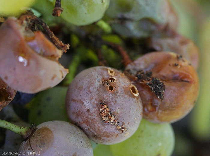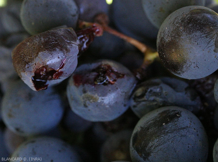 La pourriture acide débute fréquemment à proximité de l'attache pédonculaire des baies ou au niveau de diverses blessures. Les tissus altérés prennent alors une coloration qui varie en fonction de l'état d'évolution de la pourriture et des cépages. Elle est plutôt marron clair sur cépages blancs (figures 1 à 7) et violette à rougeâtre sur les cépages rouges (figures 8 à 10). Une fois initiée, la pourriture se généralise assez rapidement à l'ensemble de la baie qui, en règle générale, conserve sa forme. Sa pellicule se fragilise progressivement et des écoulements de jus se produisent, conférant un aspect luisant aux baies contiguës et situées en dessous. On observe plus rarement des amas muqueux blanchâtres consécutifs à la formation de colonies levuriennes (figure 5). Ces amas ne doivent pas être confondus avec les nombreux oeufs que les drosophiles viennent pondre au niveau des blessures des baies pourries. Certaines grappes peuvent être entièrement affectées (figure 11).