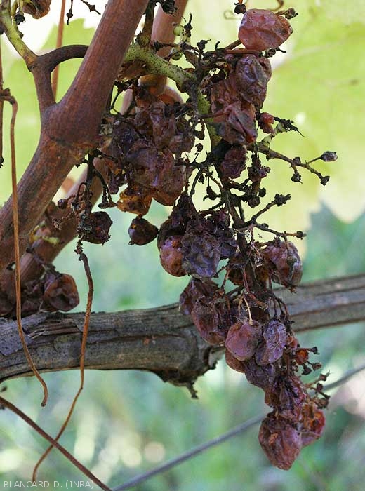 • Rhizopus stolonifer. Ce champignon mal connu sévit très ponctuellement dans le vignoble ; il se caractérise par la production de fructifications en "têtes d'épingle" noires.