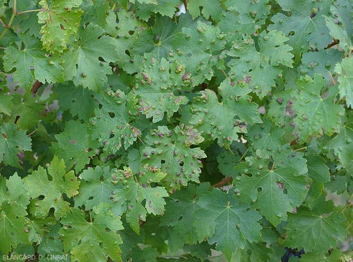 Connus depuis plus de deux siècles, les symptômes causés par Colomerus vitis se manifestent dès le printemps par la formation de galles sur les feuilles (figures 1 et 2). Ainsi, des petites cloques plus ou moins conséquentes sont visibles à la face supérieure du limbe, entrainant la déformation de ce dernier (figures 3 et 4). A la face inférieure, on note la prolifération de poils blanchâtres hypertrophiés, rougissant par la suite (figures 5 à 7).