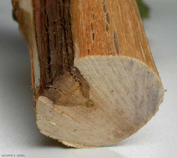 Des lésions longitudinales et sectorielles, s'initiant ou non à partir de blessures (plaies de taille, craquelures, plaies d'épamprage, désordres vasculaires liés à l'esca...), sont visibles dans le bois (figures 1 à 4). Ajoutons que certaines de ces lésions ressemblent à celles occasionnées par l'eutypiose (figures 2 et 3), mais sans que des symptômes de pousses rabougries en zig zag soient présentes sur les rameaux.