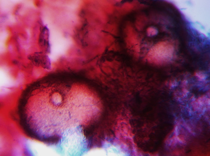 Durant les périodes humides et pluvieuses, des spores sont produites dans les pycnides et expulsées sous la forme de cirrhes gélatineux ; elles viennent après polluer les organes aériens de la vigne à la suite de projection d'eau sur de courtes distances. Par exemple dans le cas des Neofusicoccum spp., cette distance n'excèderait pas 2 mètres. Ces pycniospores (figure 1) constituent donc l'inoculum primaire.