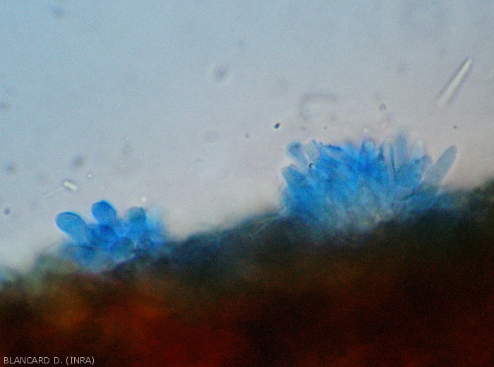 - une forme sexuée ou téléomorphe sous la forme de stromas brunâtres plus ou moins immergés dans les tissus végétaux. A l'intérieur de ces stromas, on peut observer plusieurs cavités (ou locules) contenant des asques globuleux à ovoïdes, voire ellipsoïdes, mesurant 80-100 x 11-23 µm. Ils enferment huit ascospores brunes à noires, mesurant entre 29-35 x 4,5-7 µm et montrant 3 cloisons.