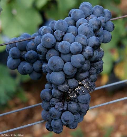 - Les baies de raisin s'assombrissent et se ratatinent progressivement, formant à terme des momies une fois totalement desséchées.