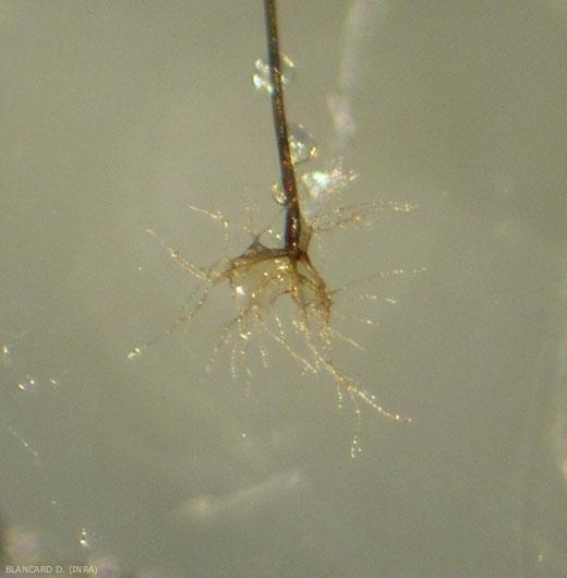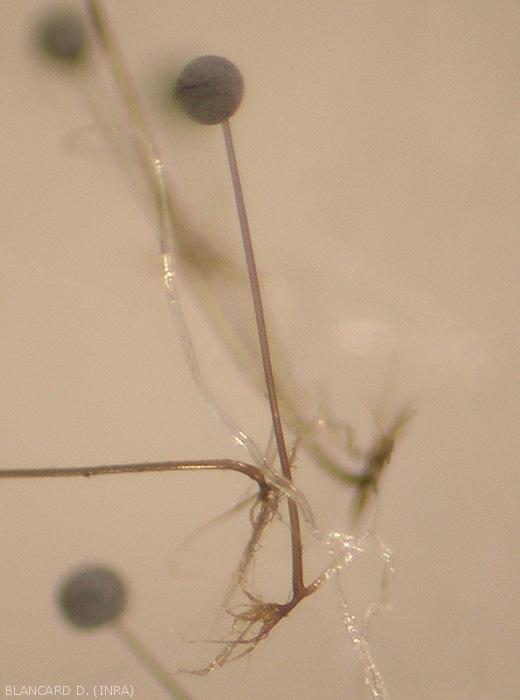 Le mycélium de Rhizopus stoloniferest en grande partie constitué d'hyphes syphonnés qui croissent rapidement. C'est à partir de ces hyphes bruns que se développent les stolons, hyphes courbés caractéristiques, à l'origine du nom d'espèce de ce Rhizopus. Lorsque les stolons entrent en contact avec le substrat du champignon (ici : la grappe), ils produisent alors des rhyzoïdes (figures 1 et 2) ramifiés à partir desquels partiront, dans le sens inverse, les sporangiophores (figures 3 à 7).