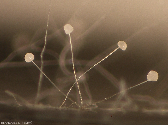 C'est à partir de ces sporanges que sont produites des sporangiospores unicellulaires, hyalines à brunes. Ces spores, rondes à ovoïdes (4-11 µm diamètre), présentent une surface légèrement striée (figure 8).
