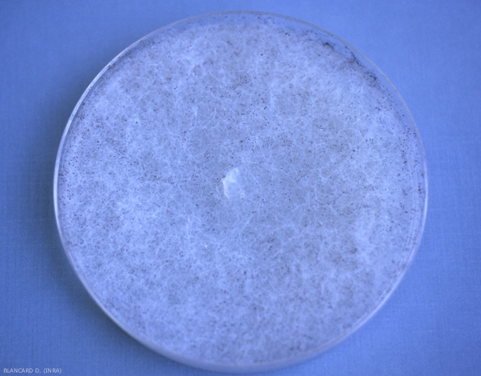 Aspect des colonies sur milieu malt-agar : elles s'étendent rapidement et ont un aspect cotonneux blanc, puis gris lorsque la sporulation se produit (figure 10). Le revers de la colonie est également blanc.