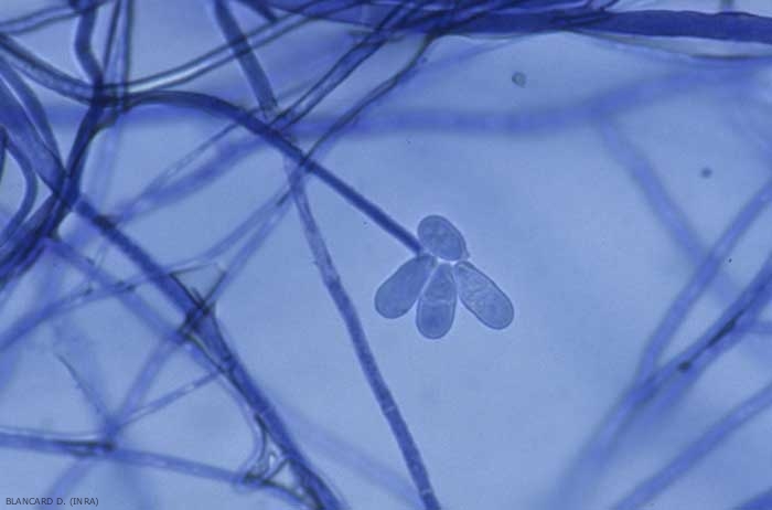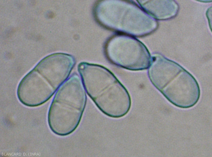 Les conidies sont hyalines (mais roses en masse) et bicellulaires, montrant une seule cloison. Leur paroi est plutôt lisse et épaisse. Elles sont cylindriques ou piriformes, mesurent 13-27 x 8-11 µm, et présentent une base rétrécie avec une cicatrice oblique (figures 5 et 6).