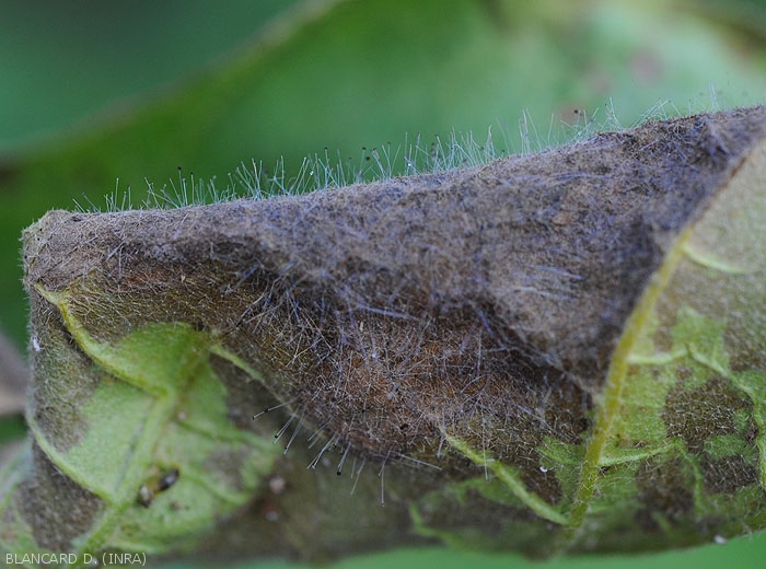Signes: une moisissure noirâtre et aérienne recouvre plus ou moins les tissus pourris. Des fructifications en forme de minuscules têtes épingle noires sont visibles.