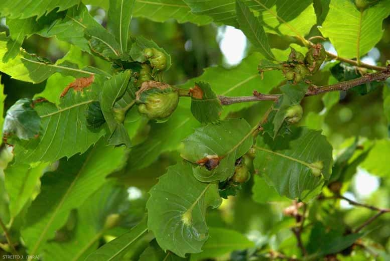 - Types de dégâts et symptômes : présence de galles ou de déformations (enroulements, boursouflures, ) caractéristiques sur les racines, les feuilles (fréquent), les branches, les bourgeons, les fleurs ou les fruits. On trouve fréquemment, à l'intérieur de ces galles ou déformations, des espèces inquilines (commensales). Beaucoup d'espèces de diptères Cecidomyiidae sont inquilines.