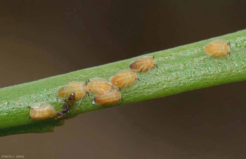 - les dégâts indirects, se traduisent par la transmission de maladies induites par des phytoplasmes ou des virus. Ces microorganismes phytopathogènes sont véhiculés par la salive lors de la prise du bol alimentaire. Ces dégâts se caractérisent souvent par des phénomènes de nanismes, de jaunisses, balais de sorcières et de dépérissements variés. L'étude des maladies à phytoplasmes est particulièrement complexe (ce sont des parasites stricts) et profite clairement des techniques moléculaires récentes. De plus en plus ces maladies apparaissent comme des pathologies graves lourdes de conséquences agronomiques et économiques. On peut également noter dans cette catégorie l'excrétion de miellats sucrés sur lesquels se développe la fumagine, un complexe de champignons noirs. Ces salissures entravent la photosynthèse et déprécient la qualité des produits (végétaux d'ornement, fruits,