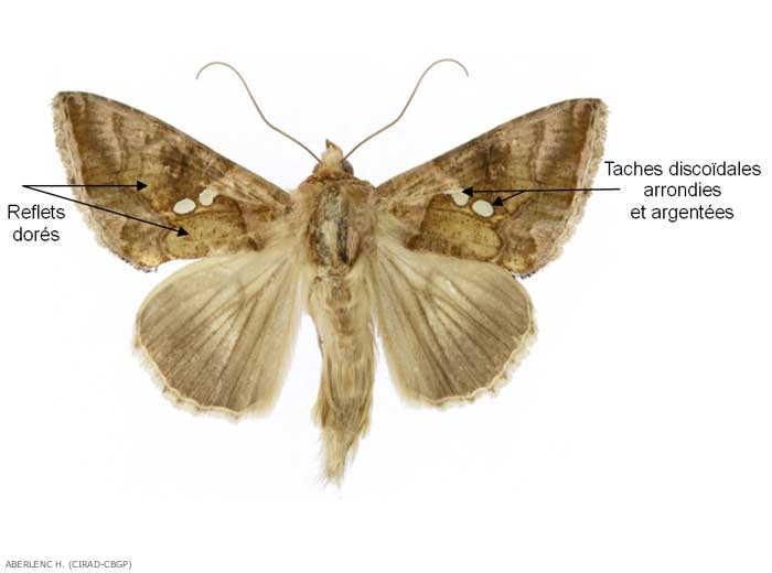 | 3 - Sur chaque aile antérieure, présence de 2 taches discoïdales arrondies caractéristiques de couleur argentée. Ailes antérieures à reflets dorés ------------------------ |