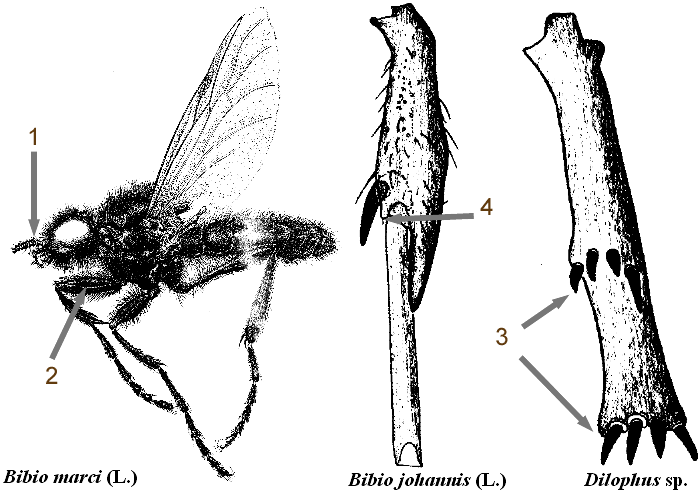 - les fémurs antérieurs sont renflés (figure 1-2) et les tibias antérieurs avec des épines (Dilophus, figure 1-3) ou une dent ventrale (Bibio, figure 1-4) ;
