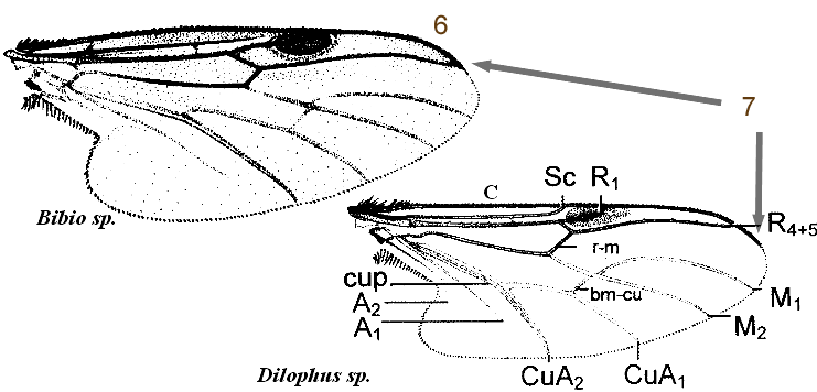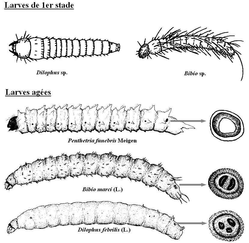- l'identification est basée essentiellement sur la forme du dernier stigmate abdominal : 1 cicatrice ecdysiale simple chez Penthetria funebris Meigen, 2 cicatrices chez les espèces du genre Bibio, 3 ou plus chez les espèces du genre Dilophus ;