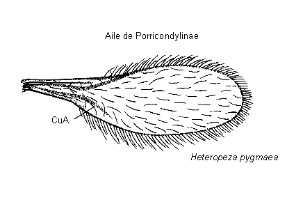 - M1+ M2 absentes (excepté chez quelques espèces Porricondylinae); ailes à nervation beaucoup plus réduite voire extrêmement simplifiée (figure 2)