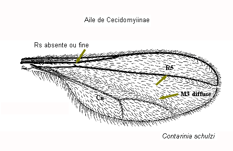 Chez les diptères Cécidomyidés, la nervation de l'aile est fortement réduite avec tout au plus plus 7 nervures longitudinales atteignant le bord de l'aile. La nervure costale est complète, elle est néanmoins interrompue au point de jonction avec R5 ou juste après celle-ci. Ces caractères permettent de distinguer trois types d'ailes correspondant à  trois sous-familles :