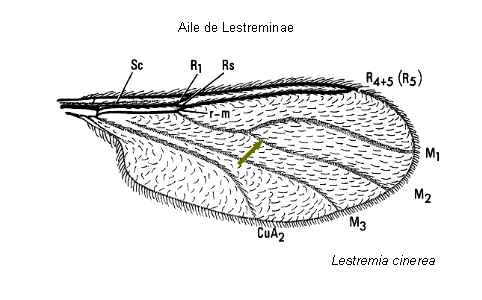 - M1 + M2 présentes formant une fourche;  ailes avec 4 à 6 nervures longitudinales (maximum 7) atteignant le bord de l'aile, Lestreminae (figure 1)
