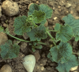Les premiers symptômes s'expriment chez le melon sous forme d'une ou de quelques taches chlorotiques sur la feuille inoculée, ils se généralisent puis évoluent en mosaïque (figures 1 à 8) . L'intensité des symptômes varie beaucoup d'une variété à l'autre et sont généralement plus sévères en été. En France, sur les melons de type Charentais, on observe une mosaïque classique sur le feuillage et parfois sur les fruits et une réduction générale de la vigueur des plantes (figure 2). En cas d'infection précoce, la production peut être fortement compromise. Chez d'autres variétés de melon, la mosaïque peut être beaucoup plus sévère et la plante reste bloquée.