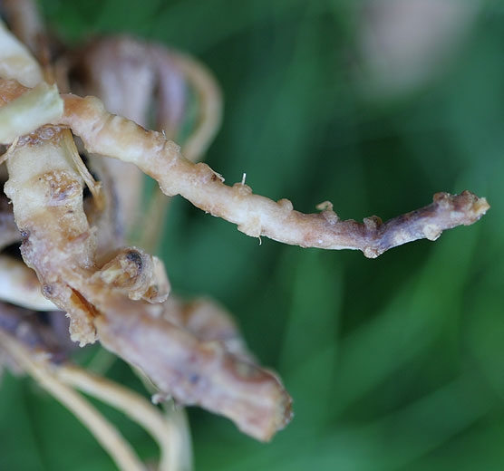 En fait, les flétrissements foliaires observés sont consécutifs à des symptômes primaires localisés sur les racines (figure 3). Sur ces dernières, on peut observer des lésions généralement brunes, de taille limitée dans un premier temps (figure 4). Par la suite, la dégradation racinaire s'accentue et se généralise. Ainsi, la plupart des racines secondaires et tertiaires altérées se détachent et se décomposent. Elles ne sont donc généralement pas visibles lorsque les plantes malades sont arrachées. Soulignons que des microorganismes secondaires peuvent envahir les tissus racinaires, en particulier ceux du cortex, et ainsi contribuer à leur destruction (figure 5).