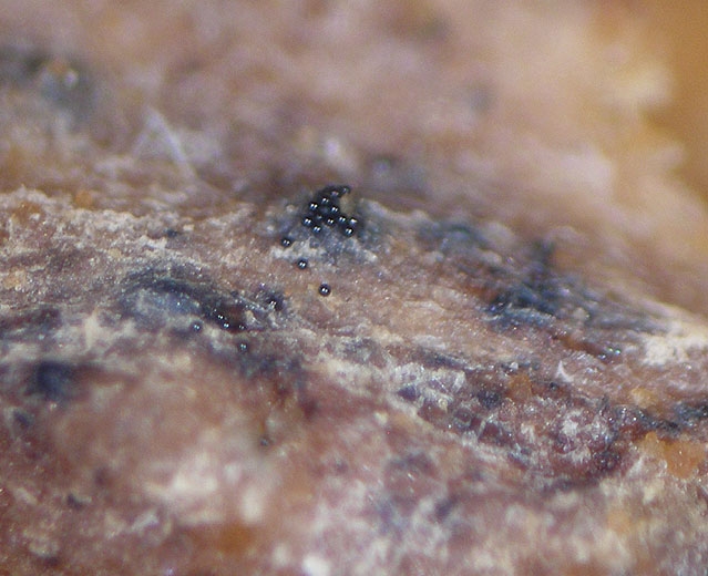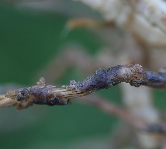 De minuscules structures sphériques noires, des périthèces de M. cannoballus et des ascospores, sont visibles à la surface des racines (figures 6 et 7) et caractérisent la présence de ce champignon. Ces signes, matérialisant la forme sexuée ou téléomorphe de cet ascomycète, ne sont pas toujours aisés à observer car ils peuvent se former sur des tissus racinaires déjà bien décomposés qui ne seront pas récupérés lors de l'arrachage des systèmes racinaires. Aussi, prenez soin d'arracher délicatement ces derniers en vous aidant d'un outil aratoire.