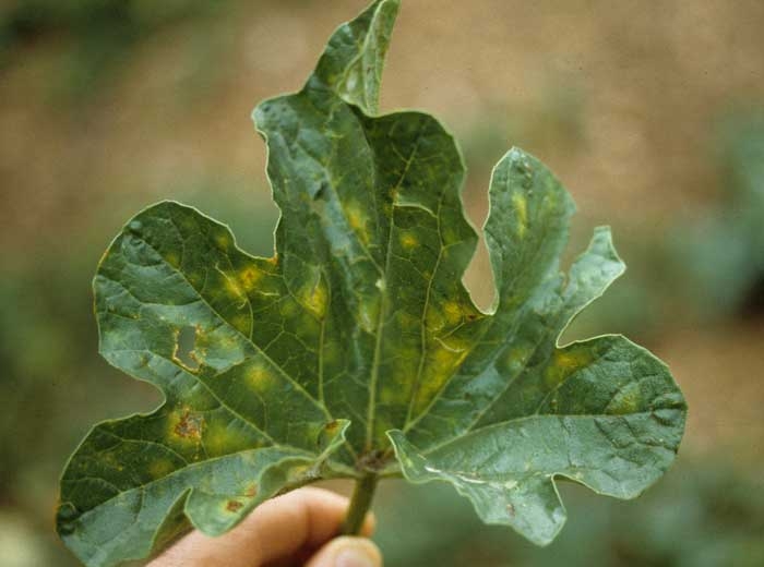 *Il convient de signaler que sur les espèces ou les variétés de Cucurbitacées peu sensibles à l'oïdium les symptômes seront atypiques et se matérialiseront par le développement de taches jaunâtres aux endroits où le champignon aura quelques difficultés à s'installer (figures 6 et 7).