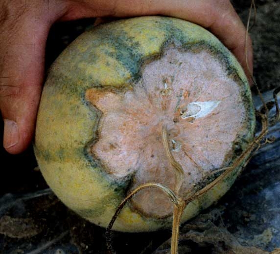 Une pourriture humide s'initie au niveau de la zone pédonculaire et parfois stylaire des fruits (figures 16 et 18). Ce symptôme est moins fréquent que les manifestations foliaires. Une moisissure rose couvre progressivement cette lésion. Le champignon parasite vasculaire ayant colonisé le fruit s'extériorise sur ce dernier. Notons que les melons pourraient manifester des symptômes après récolte.