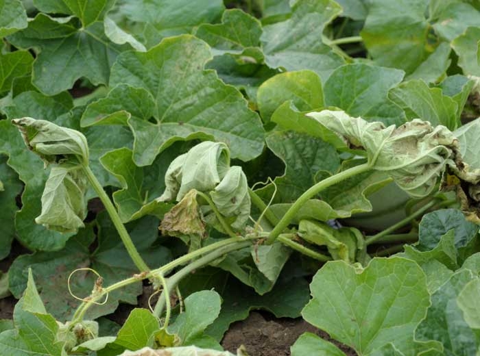 *Les symptômes foliaires peuvent varier en fonction de la souche de F. oxysporum f. sp. melonis et de la pression d'inoculum, du stade de développement de la plante (formation des fruits, nombre et/ou taille de ces derniers), et des conditions environnantes (manifestation de stress thermiques ou hydriques). Ils peuvent être observés séparément ou en même temps sur la même plante.