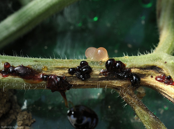 Une coupe longitudinale (figure 12) ou transversale (figure 13) dans la tige permet de constater que les vaisseaux ont une teinte sombre, voire brun rougeâtre à brun foncé. Les zones à proximité des tissus vasculaires sont également altérés : la moelle brunit et devient spongieuse, ainsi que les tissus corticaux (figure 14).