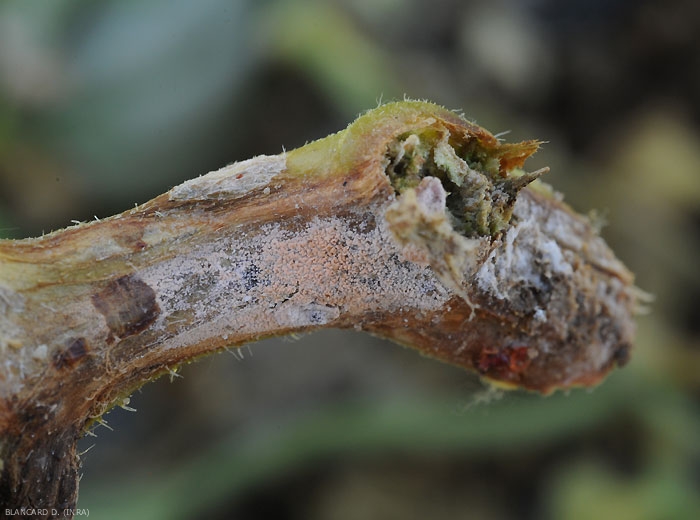 La tige présente d'abord un brunissement superficiel et unilatéral plus ou moins discontinu (figure 8). Des exsudats gommeux perlent par endroits ; ils brunissent rapidement en s'oxydant (figures 9 et 10). Assez vite, une altération nécrotique chancreuse et brunâtre se développe sur plusieurs centimètres de long. Plate et localisée sur un coté de la tige, elle apparaît tandis que les tissus touchés se dessèchent. En fin d'évolution, F. oxysporum f. sp. melonis peut fructifier sur les lésions, sous forme d'un dense feutrage blanc mât à rosé (figure 11).
