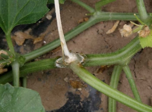 Il provoque des lésions allongées sur la tige s'initiant à partir de tissus sénescents ou blessés (fruits avortés, vrilles, pièces florales, feuilles senescentes...). Celles-ci peuvent être localisées à proximité du collet ou plus en hauteur sur la plante, notamment lorsque les melons sont palissés. Elles ont une apparence humide et sombre (figures 1 à 5), et elles finissent par la ceinturer sur plusieurs centimètres. Des exsudats gommeux bruns perlent parfois (figures 2 à 4). Notons que sur la partie distale du rameau ceinturé, les feuilles peuvent jaunir, flétrir et se dessécher.