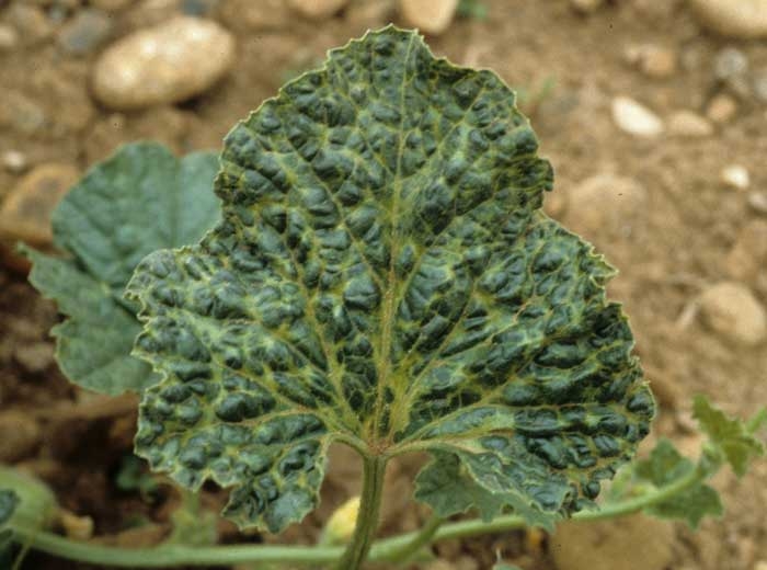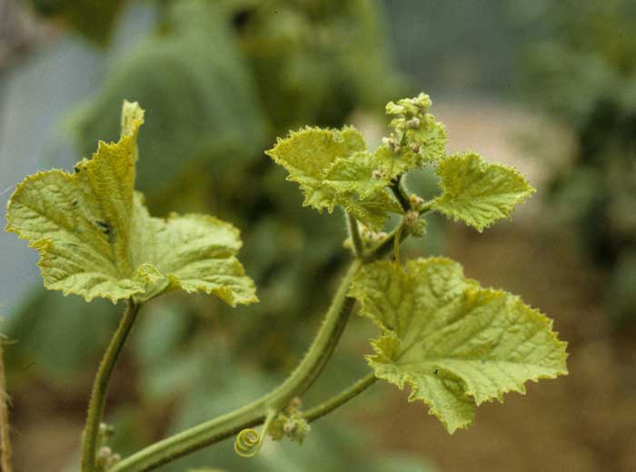 Chez le melon, les premiers symptômes observés sur feuillage sont un éclaircissement des nervures, un jaunissement et un arrêt de croissance (figure 1). Les entre-noeuds restent généralement très courts et les nouvelles feuilles sont très déformées : formes anormales, boursouflures ou cloques vert foncé (figures 2 à 4), énations* (figure 5). La plante est bloquée et prend l'aspect d'un buisson. En cas d'infection tardive, les pousses montrent un port dressé.
