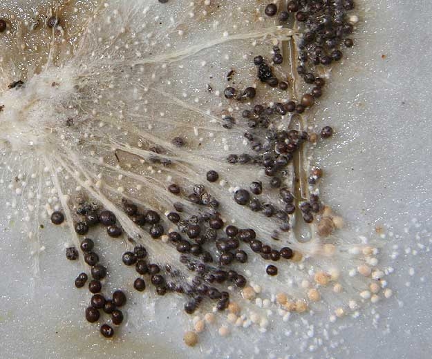 Athelia rolfsii se conserve plusieurs années dans le sol sur les débris végétaux, sous la forme de mycélium agrégé (figure 1), mais surtout de sclérotes (figure 2) qui constituent l'inoculum primaire. Ces structures sont retrouvées libres dans le sol ou associées aux débris végétaux. Leur persistance est plus importante dans les premiers centimètres qu'en profondeur. Ce champignon est aussi capable de se maintenir sur différents substrats organiques sous sa forme mycélienne à l'état de saprophyte.