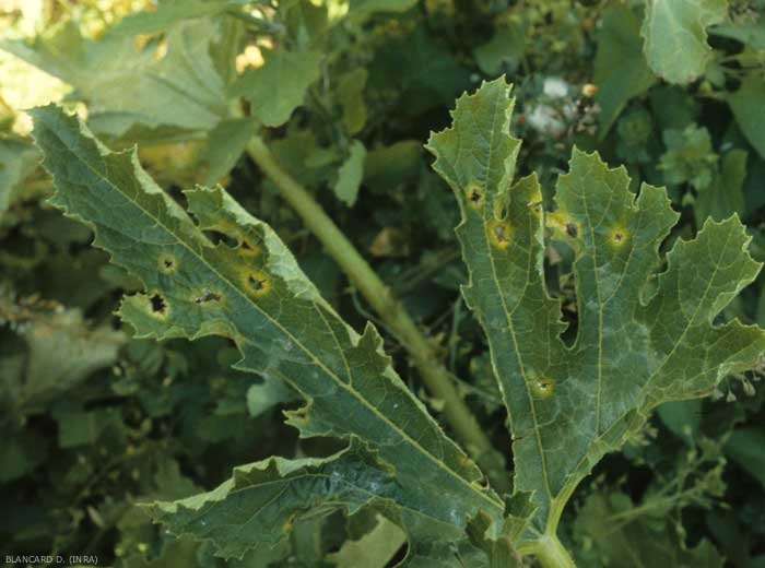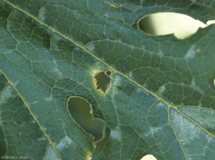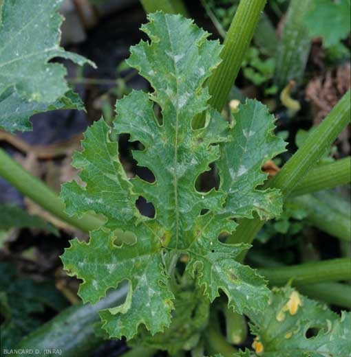 Les feuilles de courgette et de courges (figures 1 à 5) sont parsemées de petites taches graisseuses, brunissant rapidement, et entourées d'un halo jaune. Les tissus centraux altérés se déchirent et peuvent partiellement tomber.
