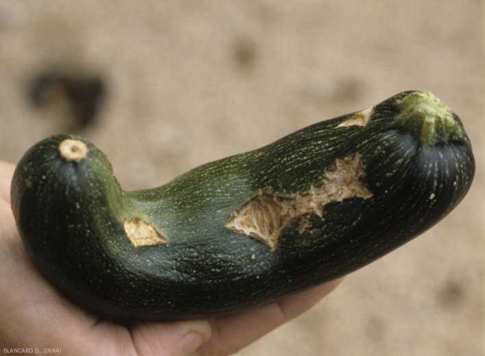 Quant aux fruits de courgette et de courges, ils présentent des petites taches graisseuses, chancreuses et brunes lorsqu'ils sont jeunes (figures 9 à 13). Une fois bien développés, ils sont parfois liégeux et fortement déformés (figures 14 et 15).