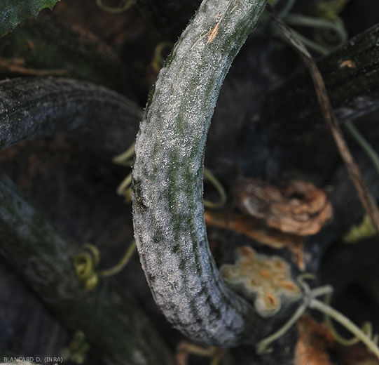 Les pétioles, les tiges peuvent aussi être affectés par l'oïdium (figure 9), les fruits le sont beaucoup plus rarement, voire jamais pour certaines espèces, ceci malgré de fortes attaques sur le feuillage. Les fruits peuvent tout de même présenter une croissance réduite. Ajoutons que lorsque de nombreuses feuilles ont été détruites, ils sont plus exposés aux brûlures solaires et montrent donc des lésions superficielles sur une de leur face.