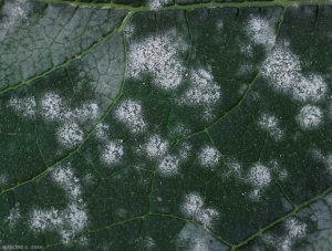 Podosphaera xanthii ou Golovinomyces cichoracearum var. cichoracearum sont à l'origine de taches poudreuses à duveteuses, circulaires et blanches, apparaissant sur ou sous les feuilles* (figures 1 à 3). Habituellement, elles se développent plutôt sur les vieilles feuilles, les plus basses et les plus ombragées (figures 4 et 10). Ces taches se multiplient, confluent (figure 5), et couvrent finalement progressivement les faces supérieure et inférieure du limbe entraînant la sénescence prématurée des feuilles. Elles sont en fait constituées par le mycélium et les conidiophores des champignons à l'extrémité desquels se forment des conidies en chaînes. A terme, les feuilles entièrement oïdiées, donnent l'impression d'être couvertes de talc (figure 6) ; elles jaunissent, se nécrosent plus ou moins avant de se dessécher et se ratatiner. Les plantes vieillissent prématurément et lorsque les attaques sont précoces et sévères, celles-ci ont une croissance plus limitée.