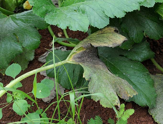Ce miellat sucré est une véritable aubaine pour plusieurs champignons du phylloplan de nombreuses plantes et de la courgette et des courges qui les utilisent pour se nourrir, et qui sont à l'origine de la fumagine (sooty mold). Leur développement sur ce substrat sucré conduit à l'apparition progressive d'une à plusieurs moisissures sur le limbe (figure 1), la tige (figure 2) et même les fruits (figure 2) qui présentent des teintes variables en fonction des espèces fongiques colonisatrices : Alternaria spp., Cladosporium spp., Capnodium sp., Penicillium sp. ...