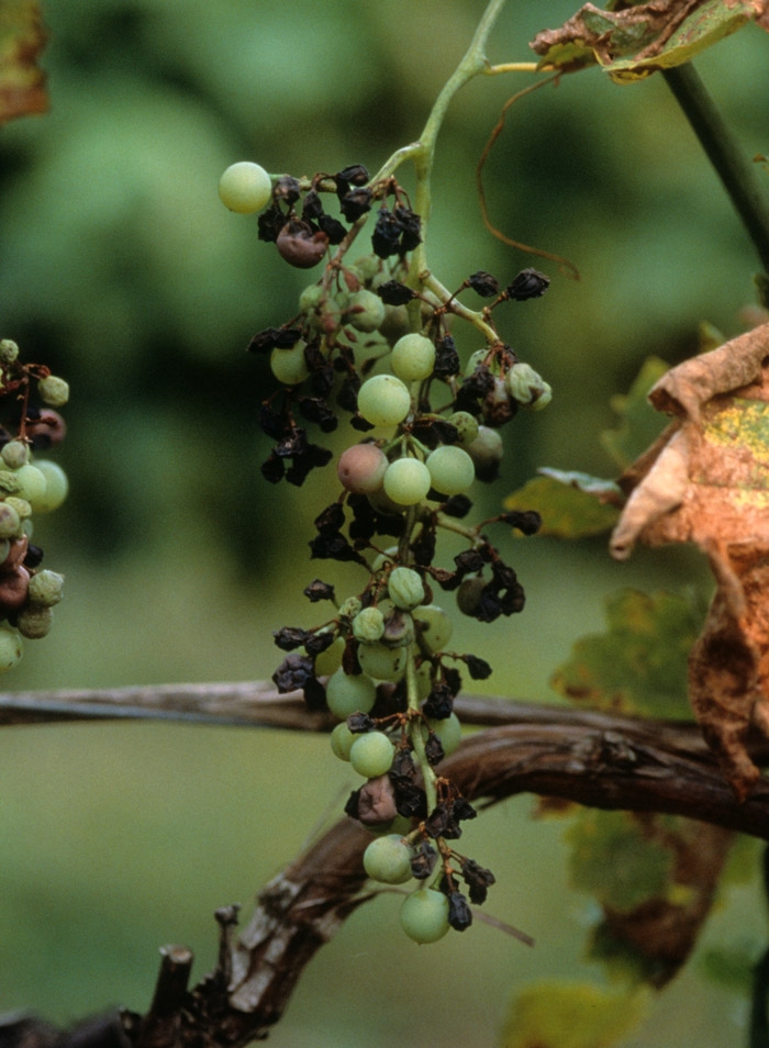 Attaque encore peu évoluée de black rot sur grappe de raisin. <i><b>Guignardia bidwellii</b></i> (Black rot)