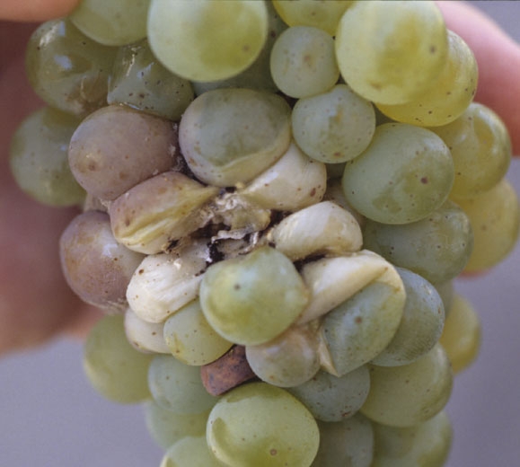 La pourriture occasionnée par <i><b>Aspergillus niger</b></i> sur baies de cépages blancs est molle et blanchâtre.