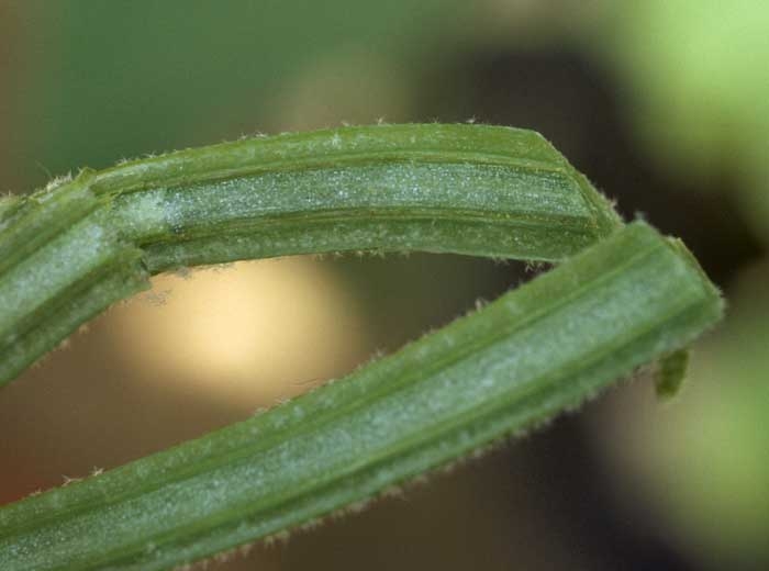Une coupe longitudinale de la tige d'aubergine révèle des vaisseaux grisâtres à légèrement bruns.  <b><i>Verticillium dahliae</i></b> (verticilliose, <i>Verticillium</i> wilt).