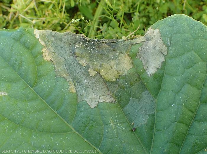 Large lésion livide et se nécrosant rapidement sur feuille de concombre. (<i>Rhizoctonia solani</i>)  (Rhizoctone foliaire - web-blight)